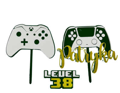 Topper na tort 🎂 urodziny dla gamera z kontrolerem w dłoni PERSONALIOWANY wybierz imię, kolor, liczbę i kontroler 3 elementy
